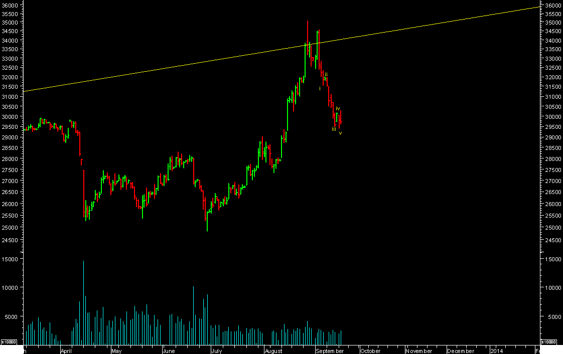 2. Close below 30859 levels on yearly basis this calendar year (i.e. Dec-2013) will confirm this count on yearly basis & then Gold in INR will be in deeper wave-II correction.