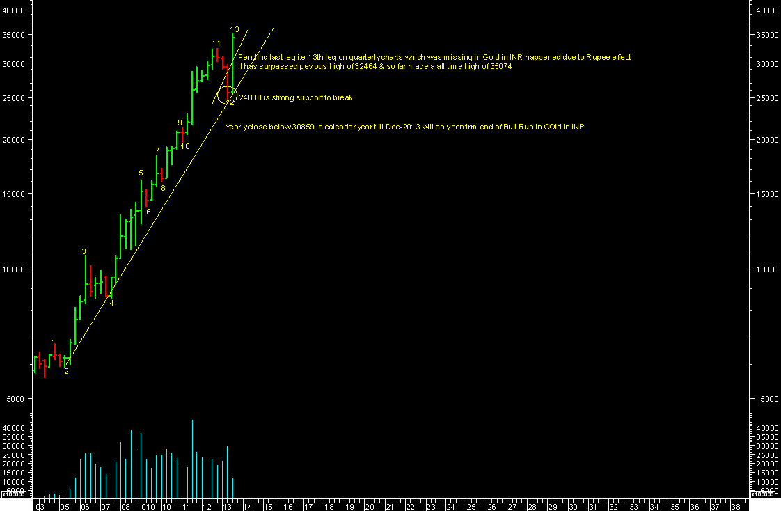 It closed at 29723 on 17.09.2013. It has surpassed the previous high of 32464 levels & made an all time high of 35074 levels beyond my anticipation but all thanks to weak Rupee effect against USD. Gold in INR was having one missing leg on quarterly charts for this Bull market (i.e. - 13th leg) as per chart attached, has finally completed it & made a new high. It started to fall from higher levels.