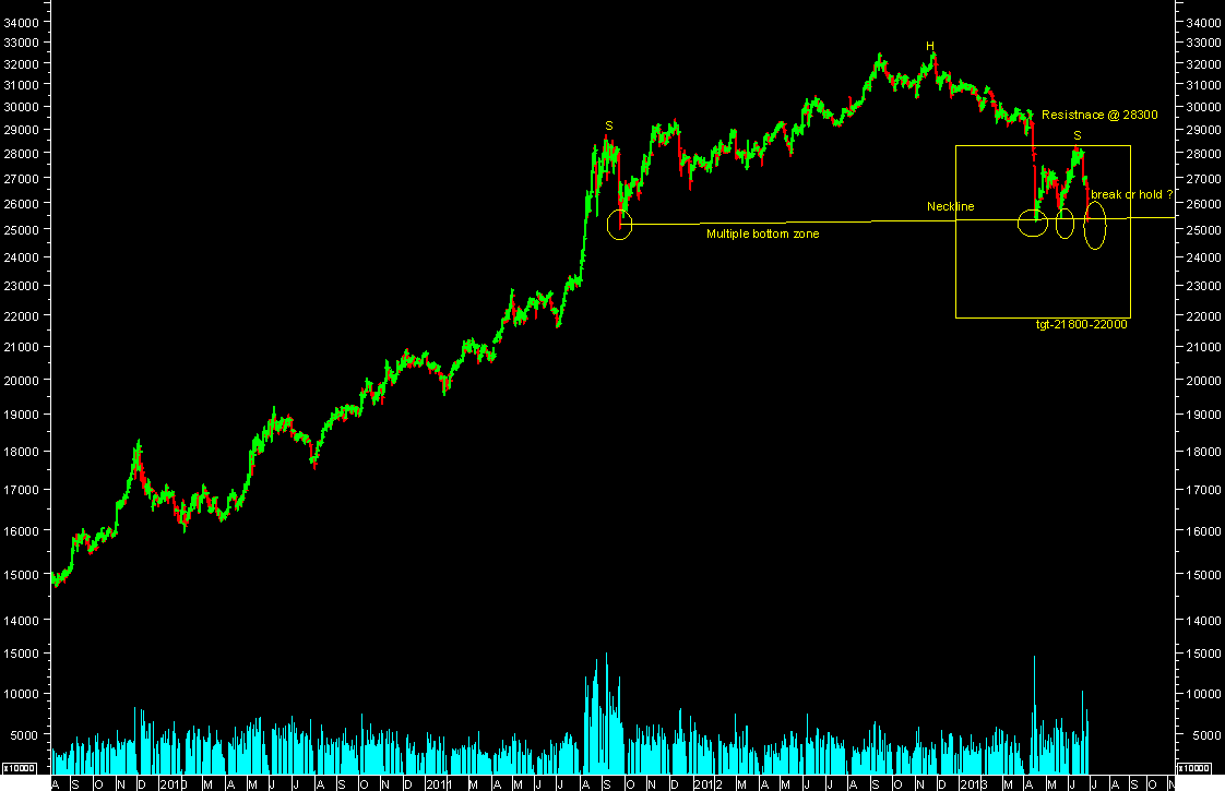 Gold closed at 25375 on 27.06.2013. It’s at the verge of breaking bearish H&S kind of pattern as per chart attached. It’s trading nearer to neckline i.e. around 25000 levels. Sustain & close below it will lead to sharp fall towards 21800-22000 levels on down side.