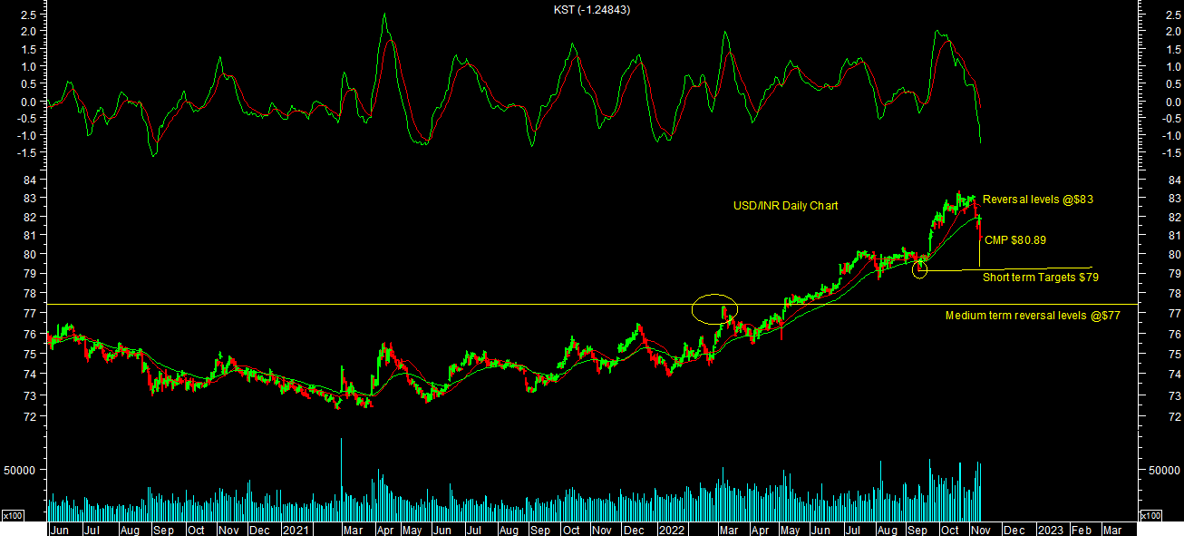 Rupee closed @$ 80.89 as on 11.11.2022. It has achieved my all Overall Medium term targets levels around $ 83 levels. It has made a high of $83.32 levels so far in this rally. It has broken crucial support of $81 levels in short term. It looks like strong case for short term reversal. One can expect targets around $79 levels in short term till it reverses. $83 is reversal levels for the same. One can expect INR to appreciate against USD in short term.