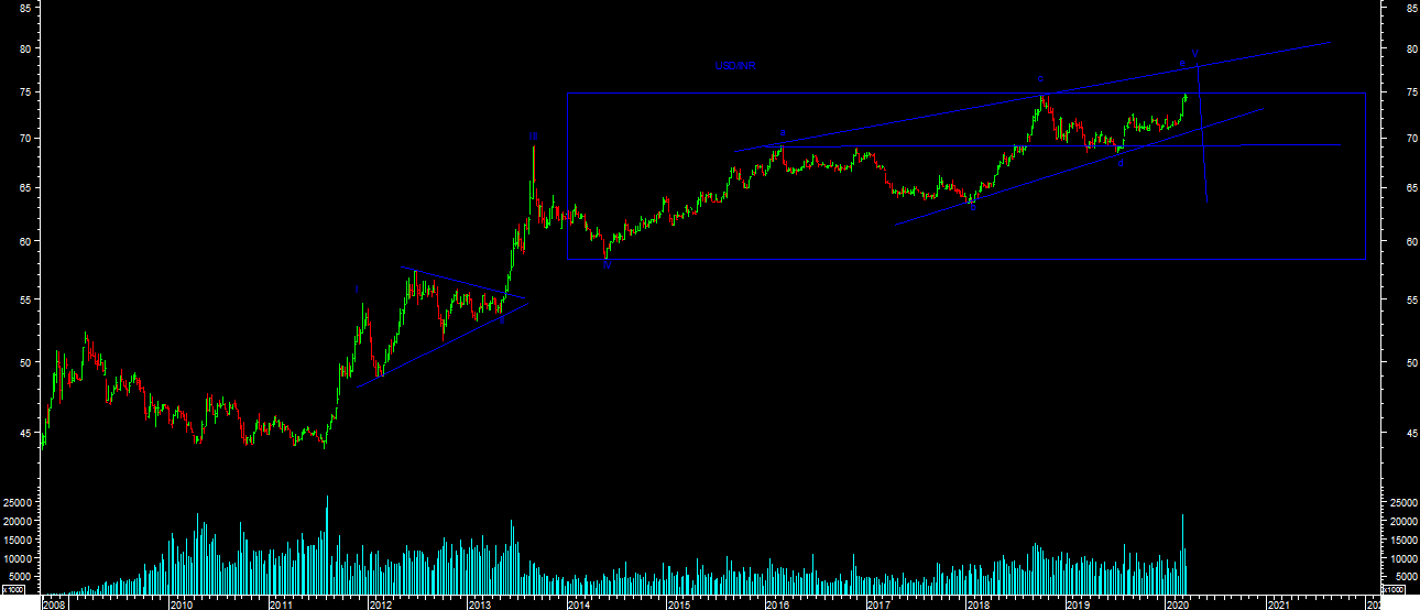 Rupee closed at $74.40 on 19.03.2020. Its showing sign of extension in short term. Its about to surpass its all time high levels of $74.68 levels which it made on 11.10.2018. It looks like ending diagonal case or missing last wave of extended wave-5 towards higher levels targets as per chart attached.