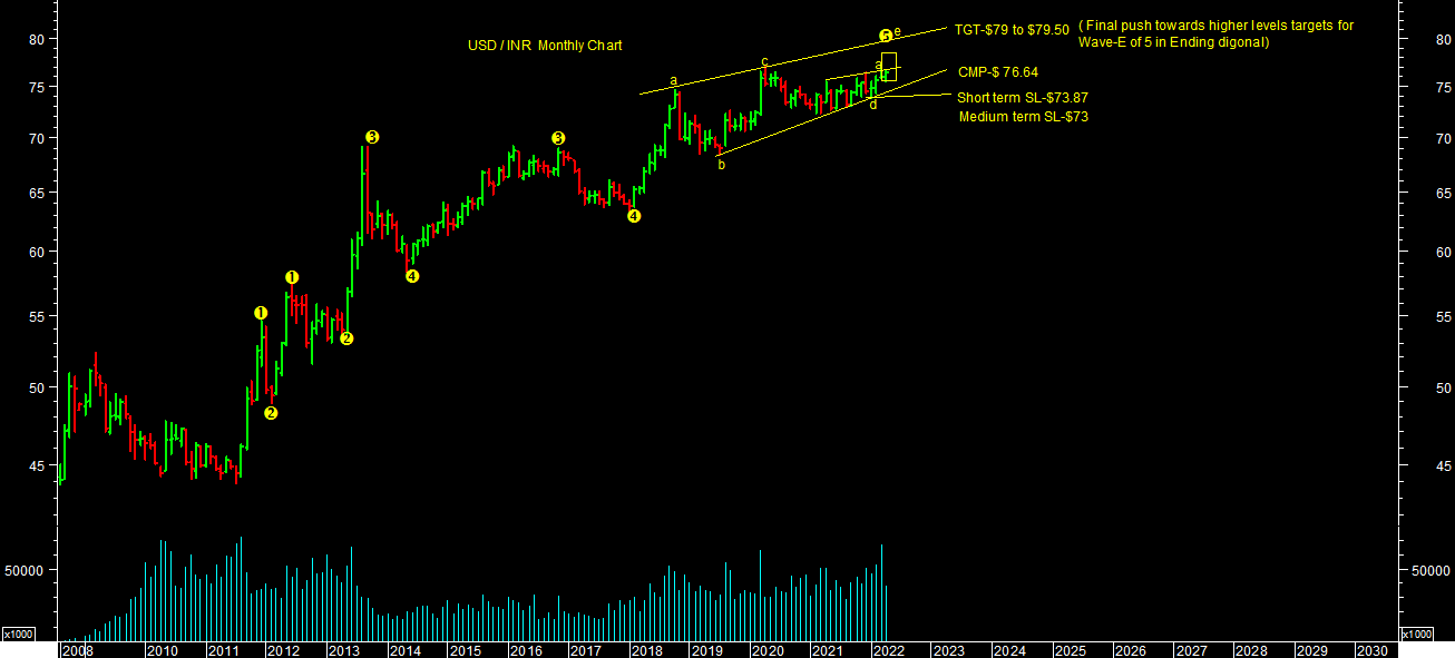 One can expect very sharp movement in USD/INR in near term towards target1-$78.50 & target2-$79.50 levels in short to medium term. It looks like final wave-C of E of 5 of ending diagonal as per overall wave counts chart attached.