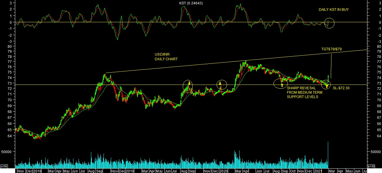 Rupee closed @$74.15 as on 26.02.2021. It holds & sharply reversed from medium term support levels of $72.30 as mentioned & expected earlier as per chart attached. One should expect $$$ to become strong in short to medium term till it holds above these support/reversal levels.