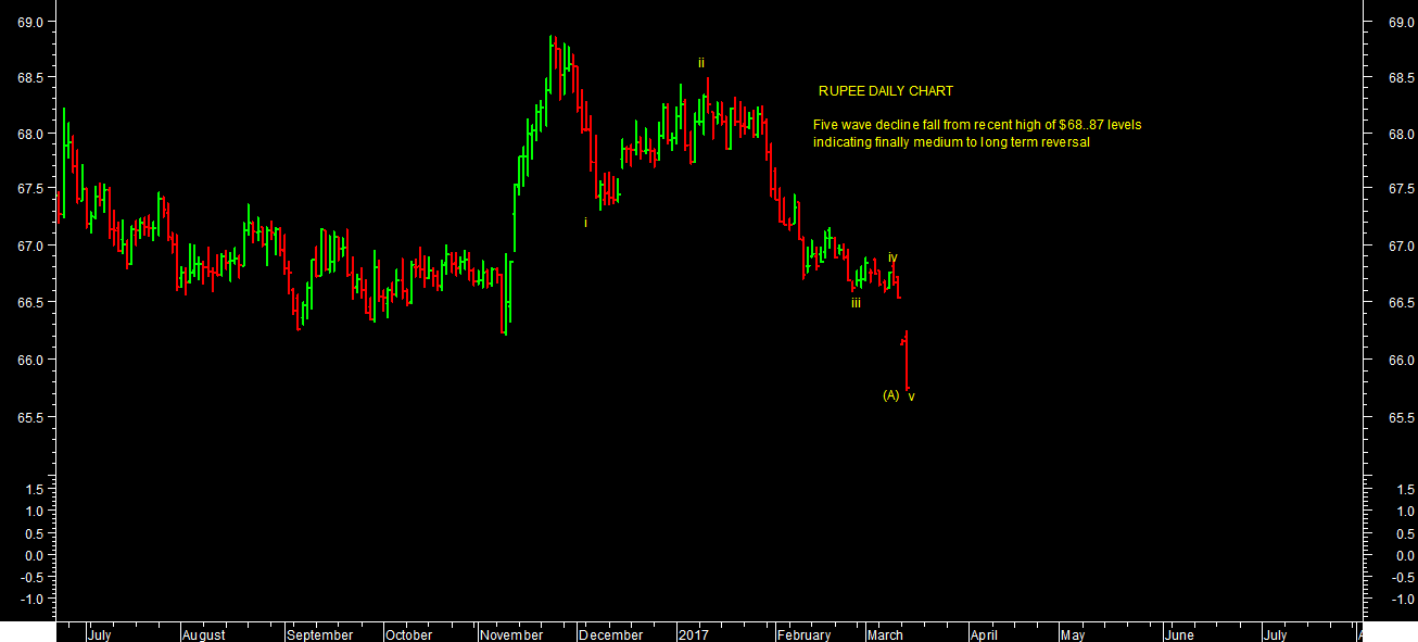 Rupee closed @$65.69 as on 15.03.2017. As expected earlier it has achieved short term targets of around $66 levels in this correction near recent lows. It made a low of around $65.40 levels so far in this fall. It has finally broken crucial medium term support & Reversal levels of $66 as mentioned earlier, its final confirmation to conclude medium to long term reversal at current levels. Rupee is going to appreciate against USD for medium to long term perspectives.