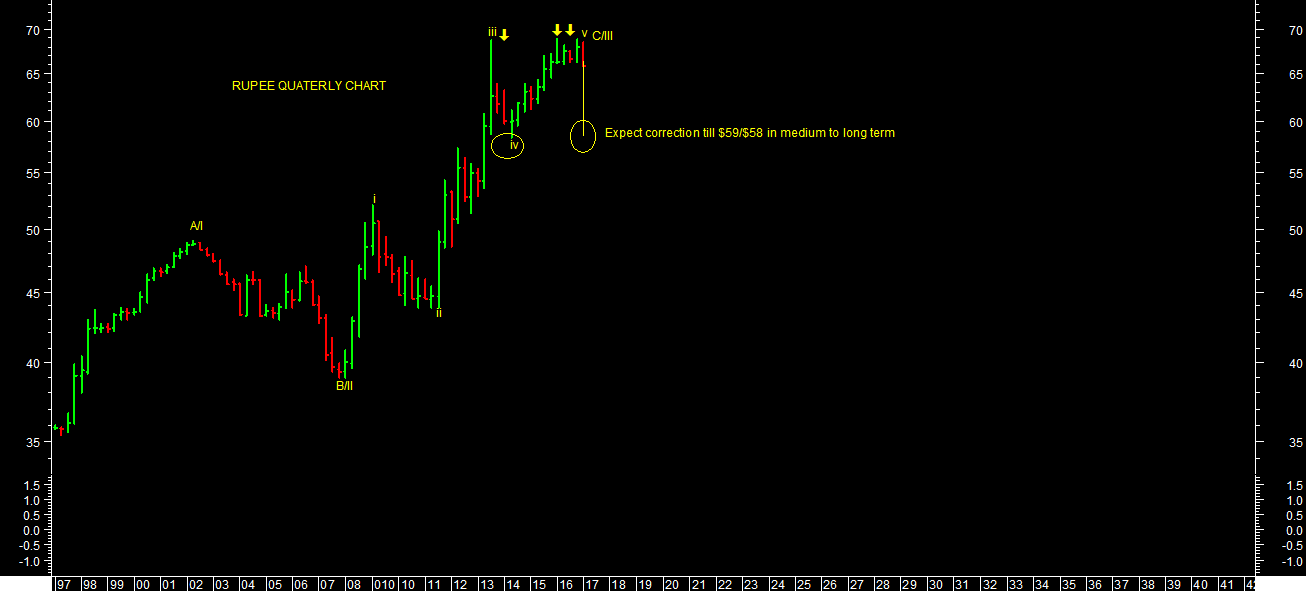As mentioned earlier about possibility of BIG TREND REVERSAL with completion of 5 wave advance rally as per quarterly chart attached with triple top around $69 levels. It can be completion of either wave-C or III as per chart attached but we are going to see major correction till $59-$58 in medium to long term perspectives. It can be time horizon of around 2-3 years.
