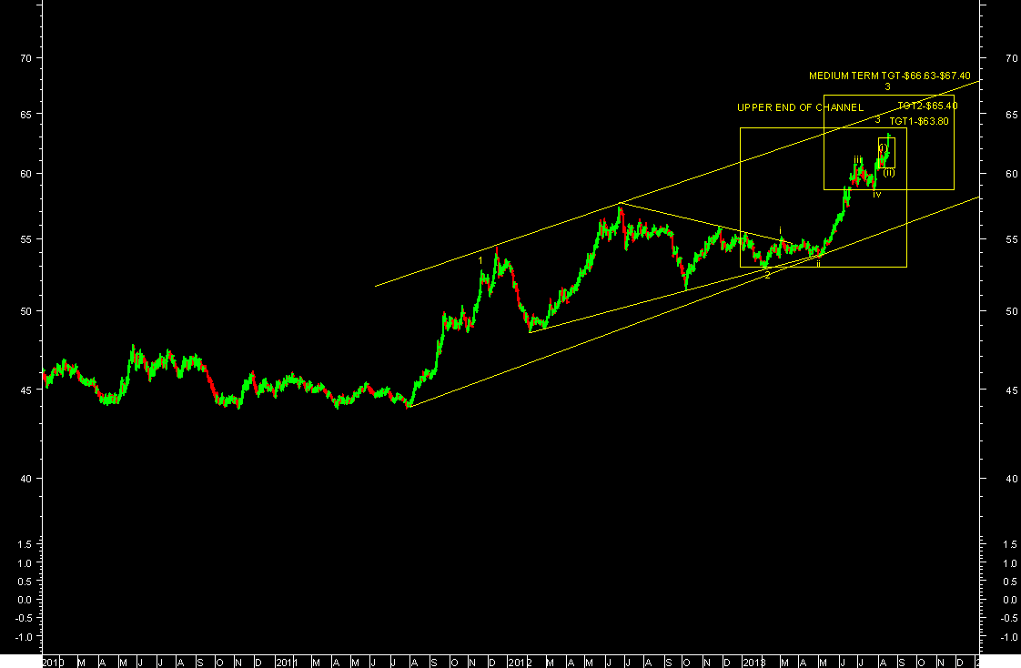 Medium term still remains UP till it trades above $57 levels & we can expect targets in the range of $66.63-$67.40 levels (i.e. - Upper end of channel). It’s trading in very good parallel channel as per chart attached. Short term correction will be wave-IV only & it still remains wave-V UP pending in medium term for higher levels targets.