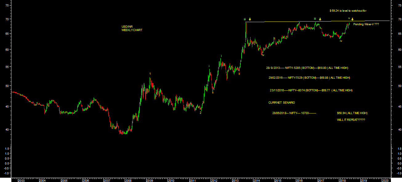 Rupee closed @$68.83 on 29.06.2018. It has made fresh all time high around $69.09 levels. It significantly depriciated in past 5 months against USD. By looking at speed, It looks like surprise pending wave-V from wave count perspectives as per chart attached which reached upper end of the range as per chart attached. It has strong resistance around $69.25 levels as per chart attached. Till it holds it looks like its still not completely out as per my earlier view & We can still see Rupee to depriciate, if it holds these levels from medium to long term perspectives.