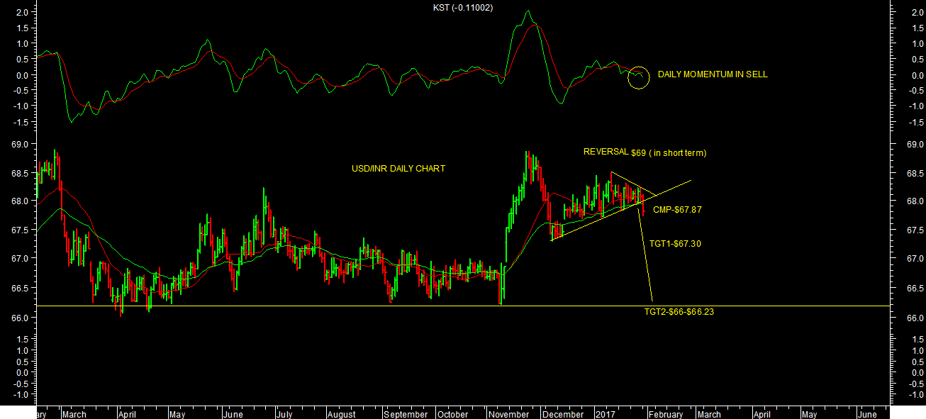 Momentum indicators of daily/weekly & monthly charts, all are in sell at current levels showing weakness. One can sell USD/INR at CMP-$67.87 with SL-$69 for the tgt1-$67 & tgt2-$66 in short term. Risk reward is favourable to sell at current levels.