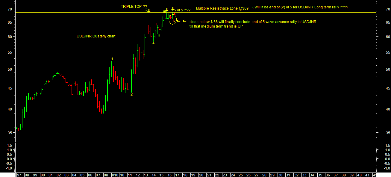 It can be end of 5 wave advance rally as per quarterly chart attached with triple top around $69 levels. I am throwing this possibility for medium term perspectives as BIG TREND REVERSAL but waiting for more evidences to finally conclude the same. But levels wise till it holds $66 levels, medium term trend is still UP for Rupee.