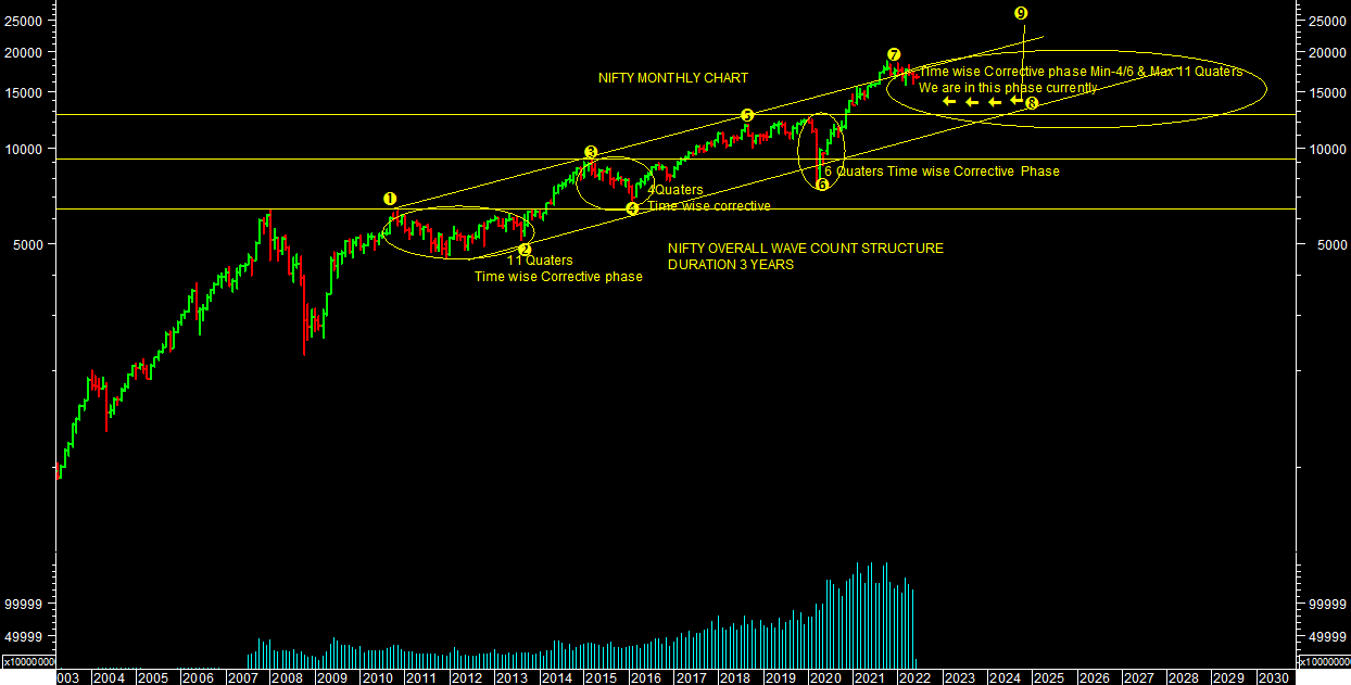Nifty & sensex closed 16584.30 levels & 55769.23 levels on 03.06.2022. Sensex, nifty, Bank nifty & other Indices have completed 2 year rally after Covid crash of March 2020. We have seen upside rally till 18.01.2022 in the market. We have created TOP for this phase of rally. We are in Time wise corrective phase as per overall wave counts structure as per chart attached.