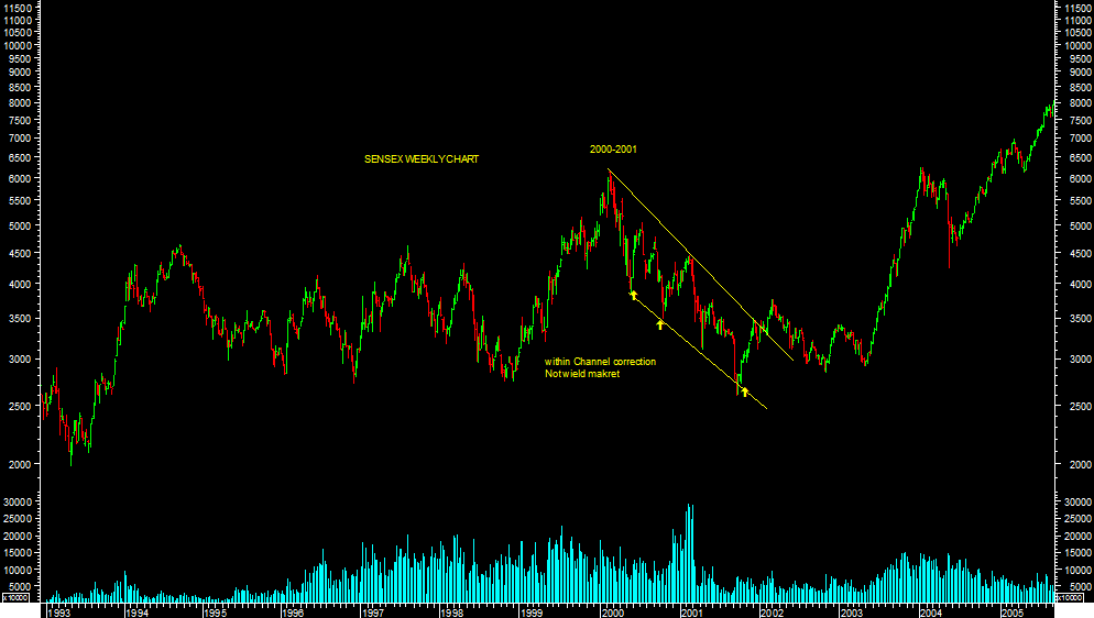 I have also attached weekly charts of sensex 2000-2001 case & also 2008 & 2015/16 current cases. One can see channelised corrective phase of 2000-01 case & channel break down case of 2008 market. Therefore, conclusively, it looks like possible case like 2008. In that case we can go till further lower levels till 22200-21200 levels as per chart attached.