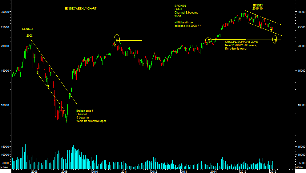 I tried & studied various Bear market like -1986/88, 2000/01, 2008, 2010/11 & finally current 2015/16. I found that In this all major bear market corrective phase, market corrected time wise within channel but only two occasion i.e.2008 & current one 2015/16 in which sensex/Nifty has broken out of channelised correction on down side Therefore, so far it looks like 2008 corrective collapse kind of phase. If it’s similar then, expects market correct sharply till 22200-21200 levels in short to medium term as market out look view not beyond that if this analysis is correct.