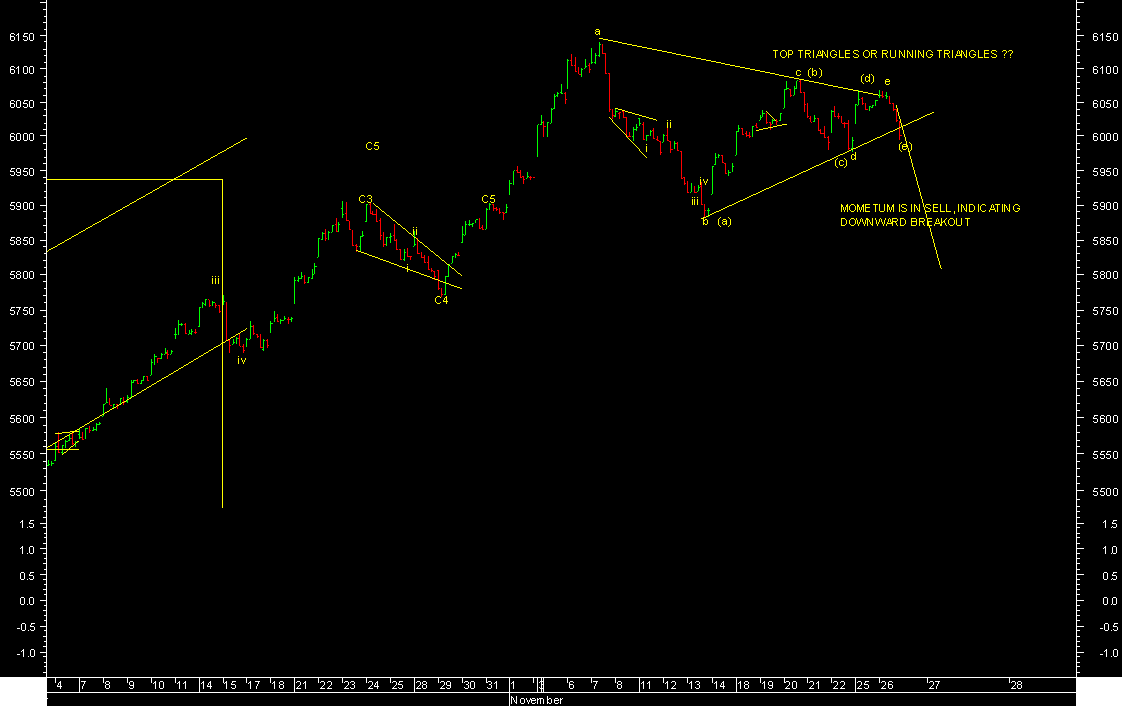 Market is showing likely chance of breakout of this consolation range of 5970-6230 on downsides as per chart attached with respect to wave counts & momentum.