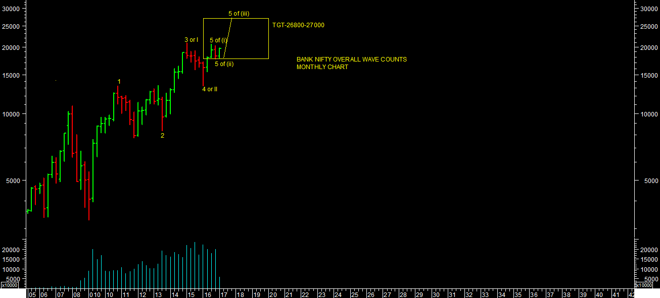 BANK NIFTY also confirmed medium term reversal. It made a low of 16,717 on 26.12.2017. From overall wave counts perspectives, it can be either wave-III of wave (iii) of V (Extended wave-V) as per monthly chart attached. But conclusively in spite of different wave counts overall view remains bullish for higher levels targets till 26800-27000 levels in medium to long term.