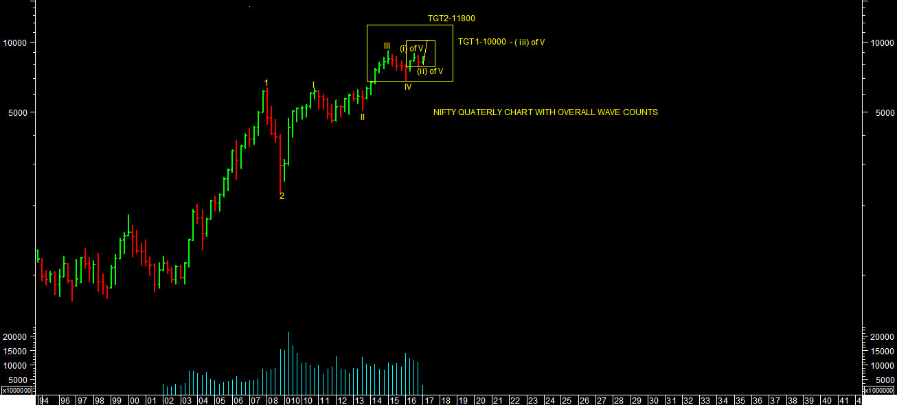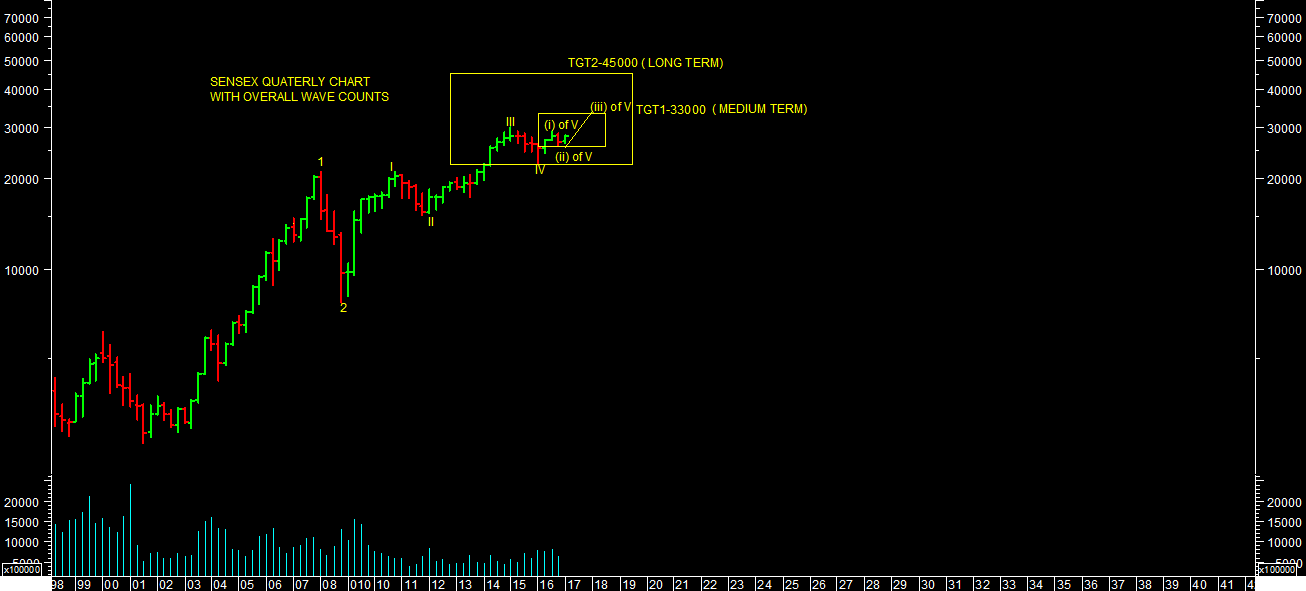 Overall Wave counts are not conclusive. It can be either wave-III or (iii) of V as per quarterly charts attached of nifty & sensex. But conclusively in spite of different wave counts overall view remains bullish for higher levels targets in medium to long term. One can expect target1-10000 levels & taregt2-11800 levels on nifty and for sensex target1-33000 & target2-45000 levels in medium to long term.
