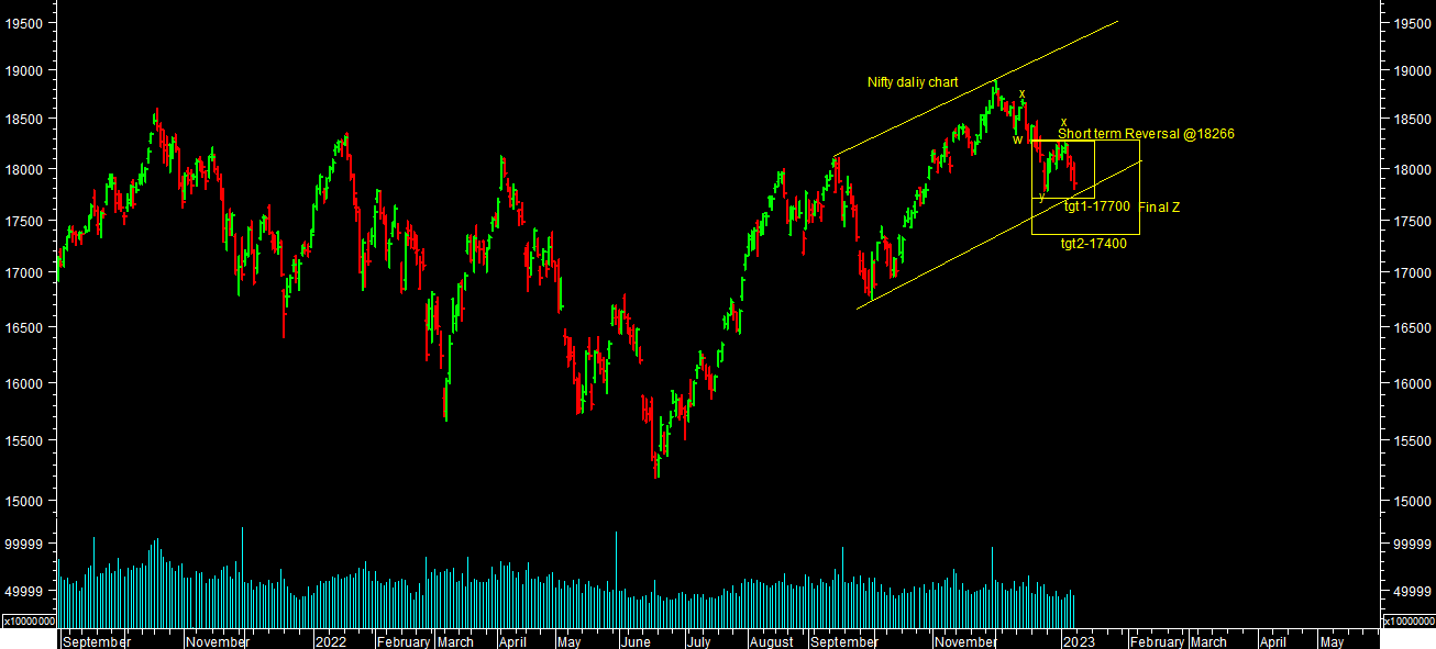 The main indices nifty & sensex is trading in channel asper daily chart attached. It has reached near lower end of range. Wave count is not clear at current levels. But this correction near lower end of range or near medium term reversal levels is buying opportunity for investment perspectives till medium term reverses.
