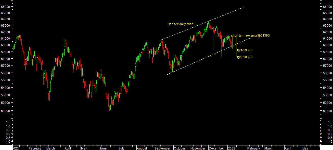 Market closed in negative territory at 59,900.37 (-452.90)NEAR LOWER END OF SUPPORT ZONE: TRAIL TILL IT REVERSES