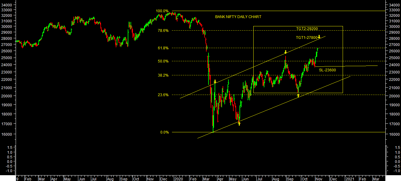 BANK NIFTY is outperforming in this rally. It has managed to find support around 23600 levels till it holds one can expect higher levels target1- 27800 & taregt2-29200 levels. 23600 is final level to conclude medium term reversal on bank nifty.