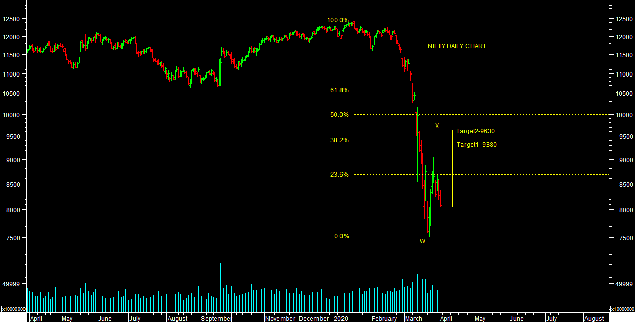 Market managed to hold crucial support levels after achieving short term targets levels near recent lows. It made a higher low & sharply reversed from lower levels today. It has already achieved my short term targets near recent lows. It made a low of 7511.10 levels on nifty & 25,638.90 levels on sensex so far in this correction. It looks like possibility of wave-X kind of pull back rally for higher levels targets as mentioned below till short term reverses. In other possibility, it may consolidate in broad range of 8000-9000 levels on nifty in short term. Trader should strictly follow trend with proper risk management.
