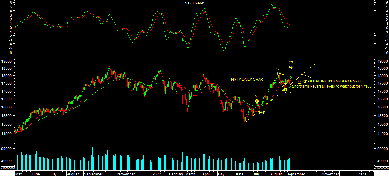 Momentum indicators Daily KST is in BUY & Daily MACD are in SELL indicating volatile short term trend. Trader should be Stock specific & keeps regular profit booking in this pullback rally while Investor should use any kind of correction or consoldation to buy stock specific in tranches in disciplined manner from long term perspectives.