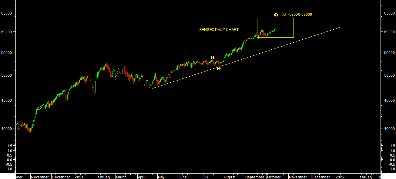 Market closed in Positive territory at 61,305.95 (+568.90)EXTENSION OF EUPORIC RALLY FURTHER TOWARDS REVISED HIGHER LEVELS TARGETS IN SHORT TO MEDIUM TERM: TRAIL TILL IT REVERSES: