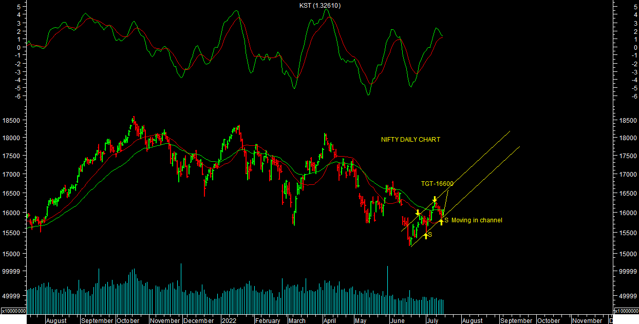 Market trading in thin range with high for volatility for the week. It closed weekly marginally in negative territory. It’s trading in channel as per daily chart attached. It managed to find support near 20 DMA as per chart attached. One should expect pull back rally to continue further with high volatility in short term. Market may trend in broad range of 15500 to 16600/16700 in near term. One should buy stock specific at current levels or any kind of decline or consolidation till short term reverses.
