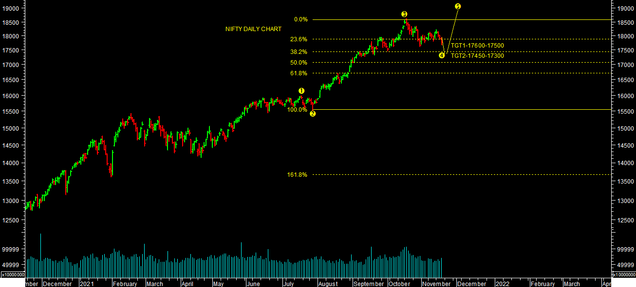 Market failed to sustain at higher levels. It made a high of 61036.56 levels on sensex & 18210 levels on nifty. It witnessed selling pressure from these levels & once again slipping towards lower end of range. Basically, it’s trading in range of 17600-18200 levels from last 4 weeks. It’s not yet started wave-V as expected last week but it’s still in wave-IV correction as per chart attached. One should watch out market behavior near lower end of range support for further confirmation of trend. Break of 17600 levels on nifty will lead to further extension of correction towards lower levels targets as mentioned bellow in short term. Alternatively, it may consolidate in the range of 17600-18200 levels on nifty for some more time in short term. One should be very stock specific, Less Leveraged & keep periodic profit booking & Risk Management discipline in this phase of rally in market & Follow trend till it reverses.