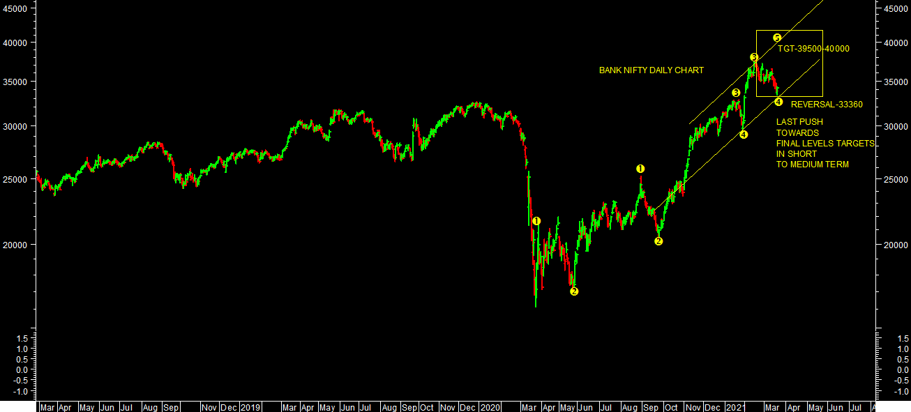 BANK NIFTY also looks like completed short term correction cum consolidation. It made a low of 33360 levels so far in this correction. It also managed to hold lower end of support zone as per chart attached. One can bank nifty to move towards higher levels target1-39500 & target2-40500 levels in short to medium term till this support holds. 33360 in short term reversal or the same. It looks like final last leg up for bank nifty of rally started from March 2020 from overall wave counts perspectives as per chart attached. 29680 levels is strong support on bank nifty for medium term perspectives on bank nifty.