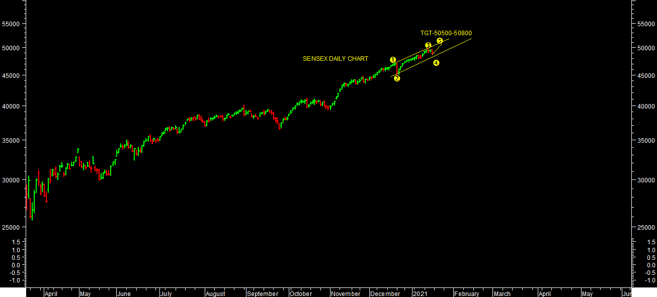 Market extending further after 2 days of correction. It made Weaker Bulls out in this correction. It made a low of 48403.97 levels in sensex & 14222.80 levels on nifty. It looks like market to extend towards final targets levels as mentioned below in short term till it reverses. One should be stock specific & book profit at regular intervals in this phase of market.