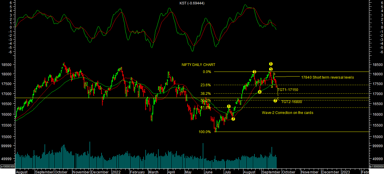Market closed weekly in negative territory. It has broken short term support of 17400 levels & 58487 levels. It looks like wave-II correction in short term as per chart attached. One can expect market to trend towards lower levels targets in short term. Market will be in corrective mode with high volatility in short term ahead of expiry next week. Derivative data too indicating bearish set up in short term. Trader should be stock specific & light in this correction till it reverses.