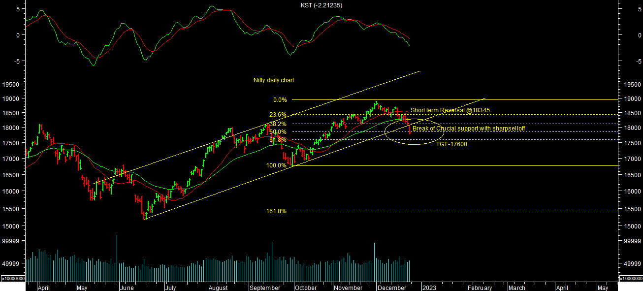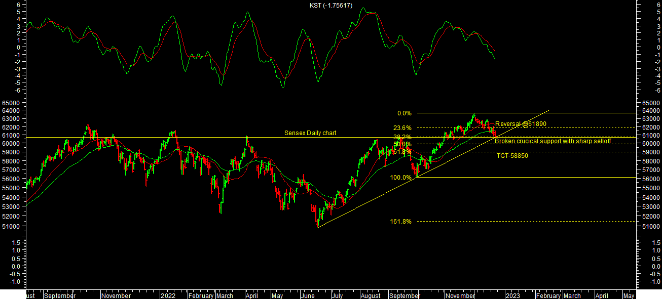 Market witnessed sharp selloff, it has broken crucial support & closed 3rd consecutive week in negative territory as per chart attached. Sensex & Nifty made a low of 60637.24 & 17779.50 levels respectively. Indecisive to continue further in short term till market reverses. Resurgent of covid in china & its effects across the globe to watch out in near term. Market is close to medium term reversal/support levels as well. It’s very important levels to watch out for final conclusion of any kind of extended correction. One should follow trend till it reverses in this crucial levels near medium term reversal levels.