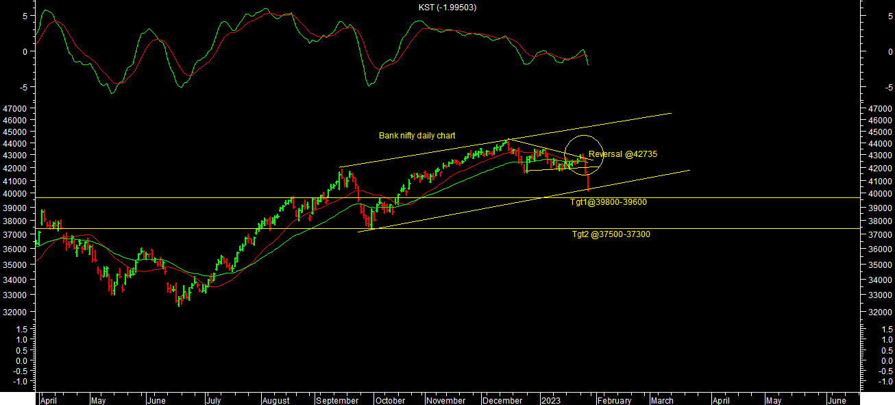 Bank nifty has also broken short term consolidation structure on down side as per chart attached. It’s time to be cautious on bank nifty for short term till it reverses. Short term outlook for bank nifty remains negative till it trades below 42750 levels & expect targets in the range of 39800-39600 levels. It has strong support around 39600 levels for medium term perspectives. Break of it deteriorate medium term chart structure & we can see sharp fall towards 37500-37300 levels in short term.