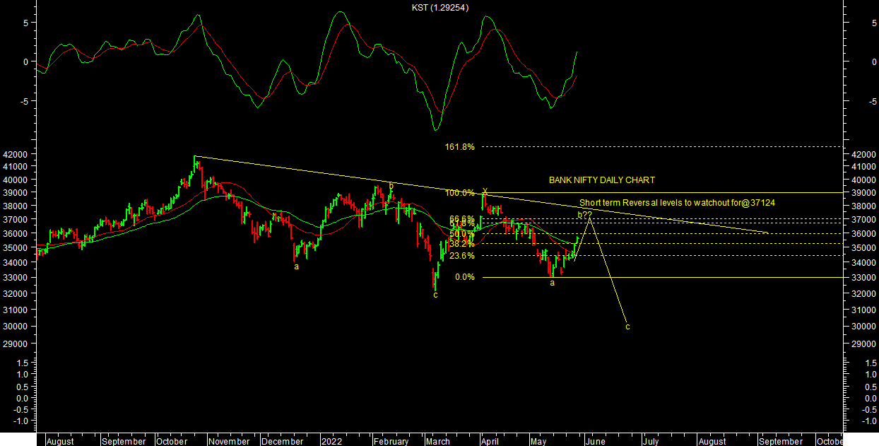 Bank nifty is out performing in short term. It has achieved my first short term targets levels near recent lows in this correction. It made a low of 33001.75 levels so far in this correction. It still looks like Wave-B Pullback rally. 36333 is short term reversal levels till it holds one can expect lower levels targets 32000 levels in short term. 39425 are medium term reversal levels for Bank nifty, till it holds one can expect lower levels targets of around 30500-30000 levels medium term. One should watch out short term reversal levels to finally conclude end of short term correction on Bank nifty.