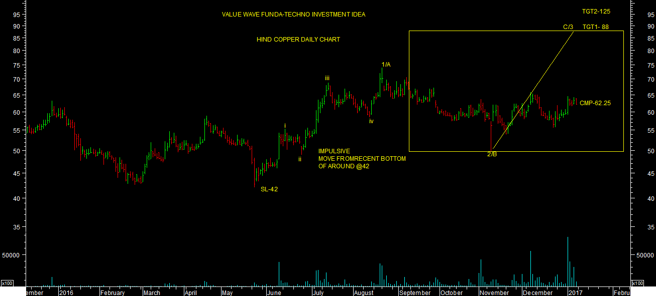HIND COPPER started impulsive trend from recent bottom of around 42 as per chart attached. Its equality target for wave-III or wave-C comes to around Rs-88 as per chart attached & extend target2 comes to around Rs-125. Its value wave funda-techno investment idea for medium to long term investor from both fundamental & Technical perspectives