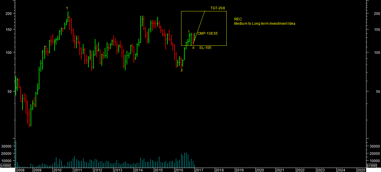 REC looks attractive to BUY at current levels. Stock started its wave-(iii) up as per chart attached. Stock also looks in multi-year long term bull phase as per chart attached.