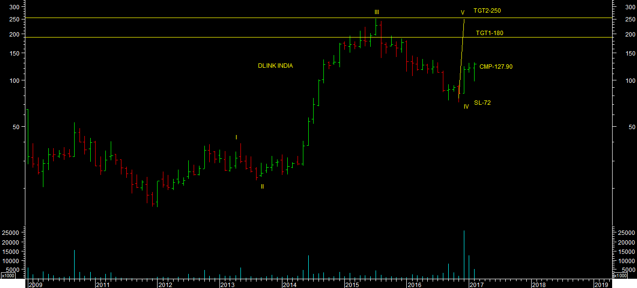 DLINK INDIA looks completed its medium term correction. It looks like completion of wave-IV correction as per quarterly chart attached. It looks like beginning of wave-V up rally in medium to long term perspectives as per chart attached.