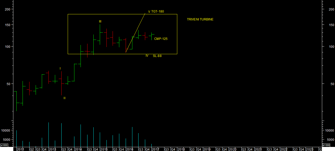 TRIVENI TURBINE looks completed its medium term correction. It looks like completion of wave-IV correction as per quarterly chart attached. It looks like beginning of wave-V up rally in medium to long term perspectives as per chart attached.