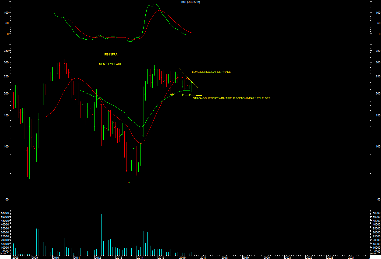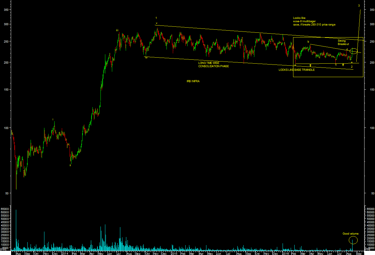 IRB INFRA looks like possibility of wave-3 strong bullish case. It consolidated time wise in range from 280-200 levels for last around 20 months. It looks like base triangle case at the end of consolidation as per daily chart attached. It has also broken out of base triangle pattern as per chart attached.