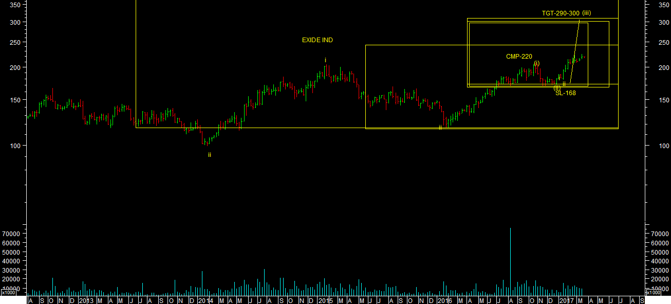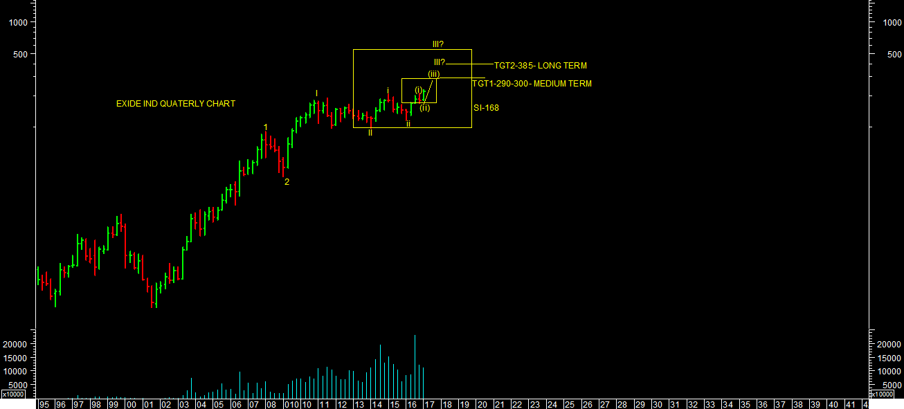 EXIDE IND has started wave-(iii) as per quarterly chart attached as per overall wave counts. It looks attractive to BUY at current levels. Stock is in very good Bull Run phase & has a very much potential of upside for medium to long term perspectives