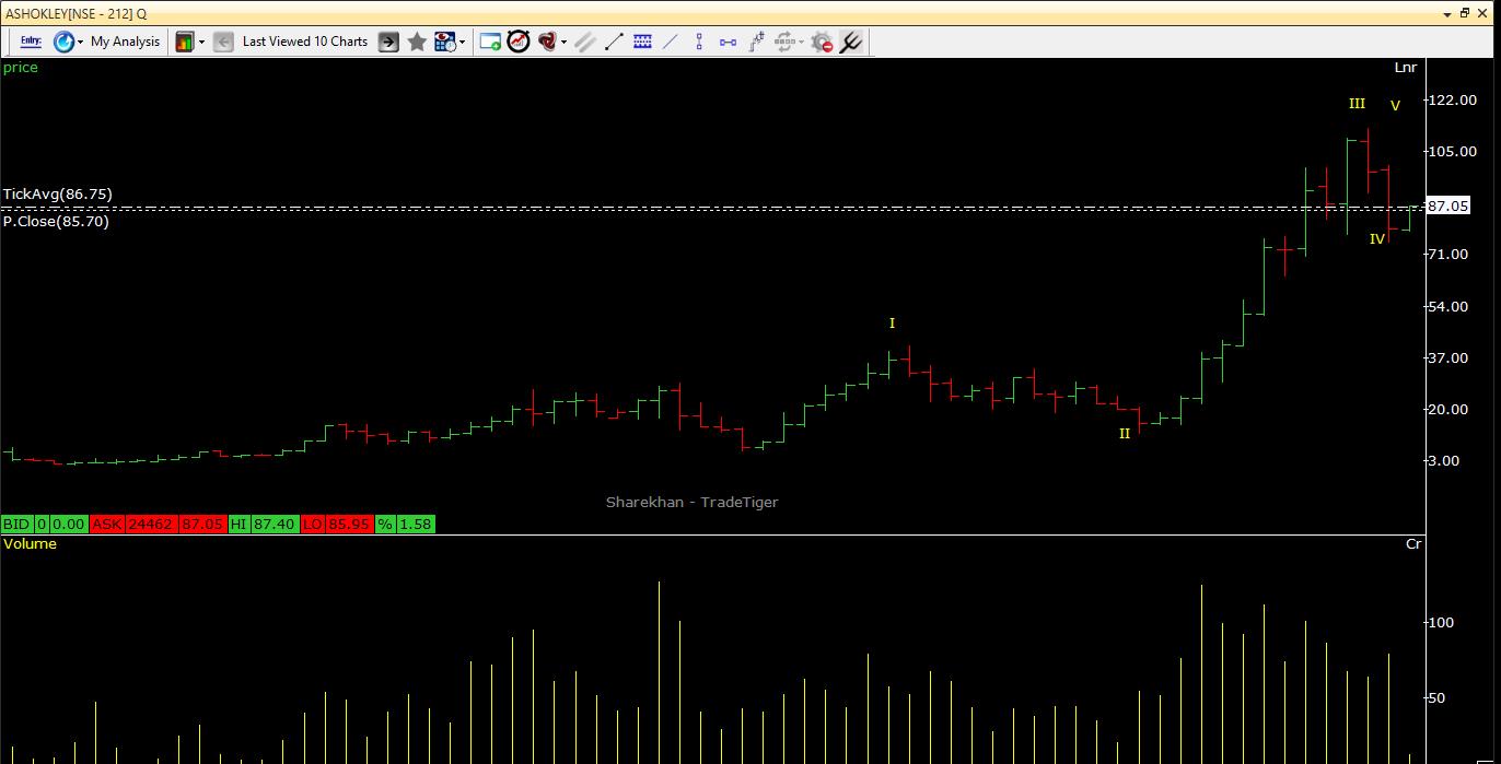 Ashok Leyland has wave-V up pending on quarterly chart. It looks like end of medium term wave-IV correction. Risk reward is favourable to buy at current levels.