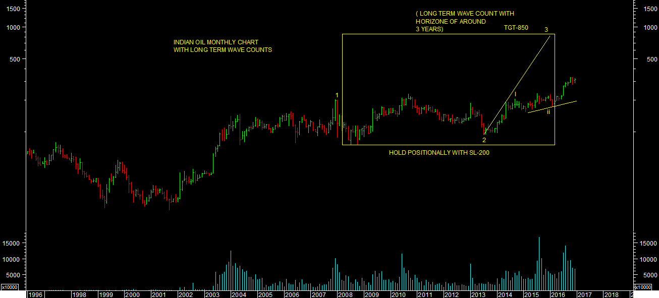 IOC started long term wave-3 as per chart attached. It has equality target for positional investor of around 850 levels as per chart attached. Its value wave funda-techno investment idea for medium to long term investor from both fundamental & Technical perspectives. One should buy at current market price or any kind of decline or consolidation with SL-200 for such positional targets in medium to long term. Risk reward is favourable to buy at current levels. One should keep time horizon for around 2-3 years for such targets.