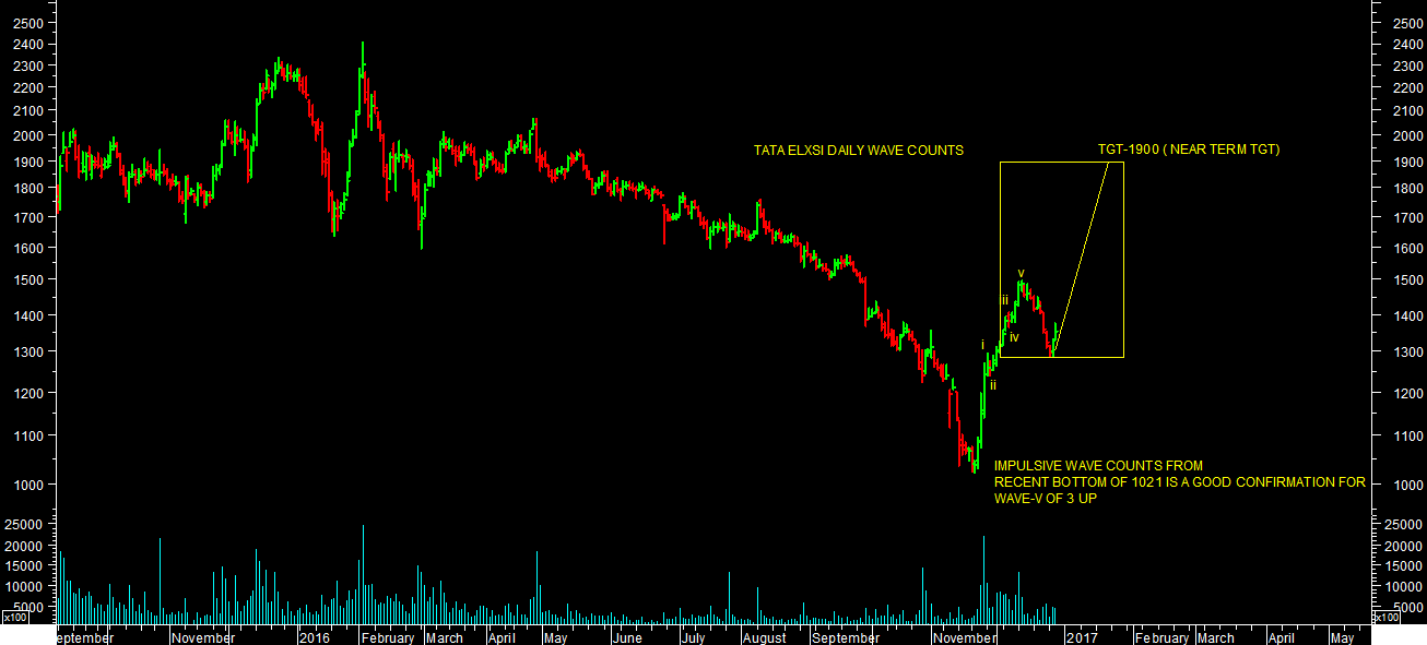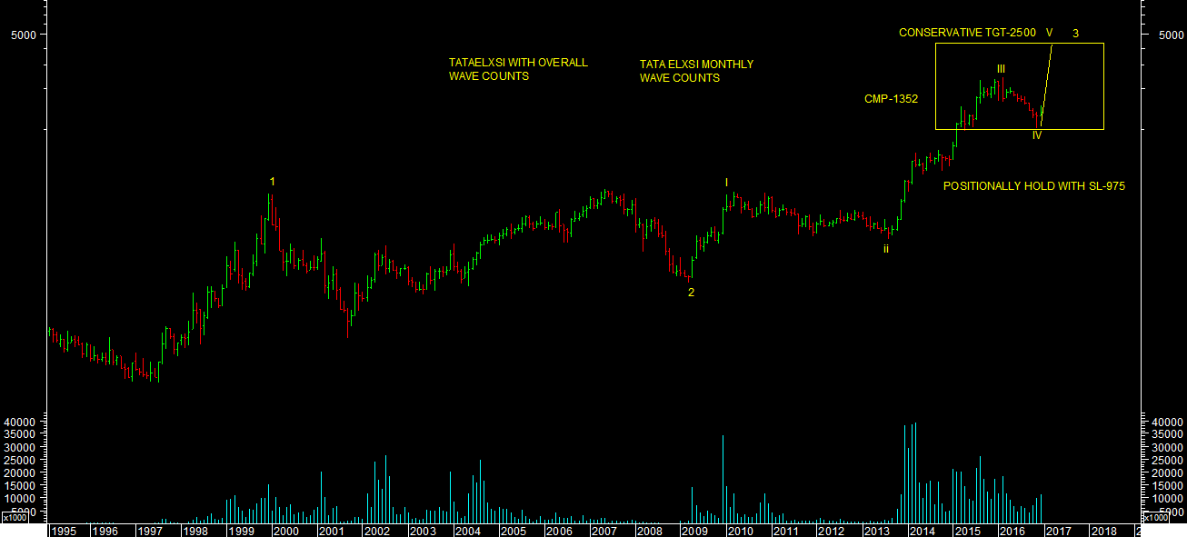 TATA ELXSI started wave-V of 3 on monthly charts. It has positional conservative target of around 2500-2800 levels in medium term from investment perspectives. Its value wave funda-techno investment idea for medium to long term investor from both fundamental & Technical perspectives. One should buy at current market price or any kind of decline or consolidation with SL-975 for such positional targets in medium to long term. Risk reward is favourable to buy at current levels. One should keep time horizon for around 1-2 years for such targets.